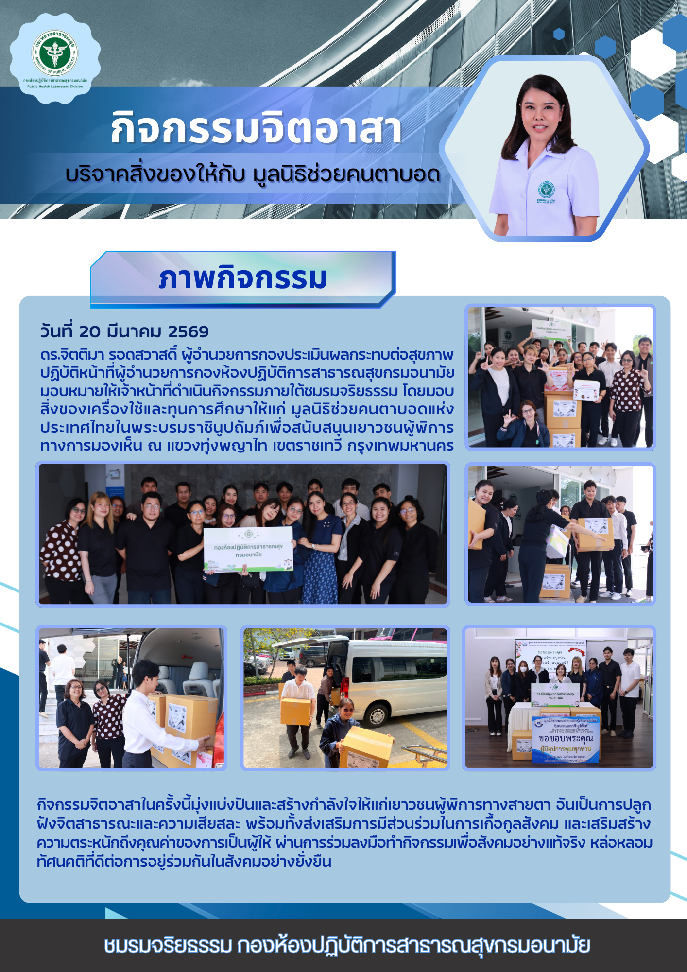 ดร.จิตติมา รอดสวาสดิ์ ผู้อำนวยการกองประเมินผลกระทบต่อสุขภาพ ปฏิบัติหน้าที่ผู้อำนวยการกองห้องปฏิบัติการสาธารณสุขกรมอนามัย มอบหมายให้เจ้าหน้าที่ดำเนินกิจกรรมภายใต้ชมรมจริยธรรม โดยมอบสิ่งของเครื่องใช้และทุนการศึกษาให้แก่ มูลนิธิช่วยคนตาบอดแห่งประเทศไทยในพระบรมราชินูปถัมภ์เพื่อสนับสนุนเยาวชนผู้พิการทางการมองเห็น ณ แขวงทุ่งพญาไท เขตราชเทวี กรุงเทพมหานคร